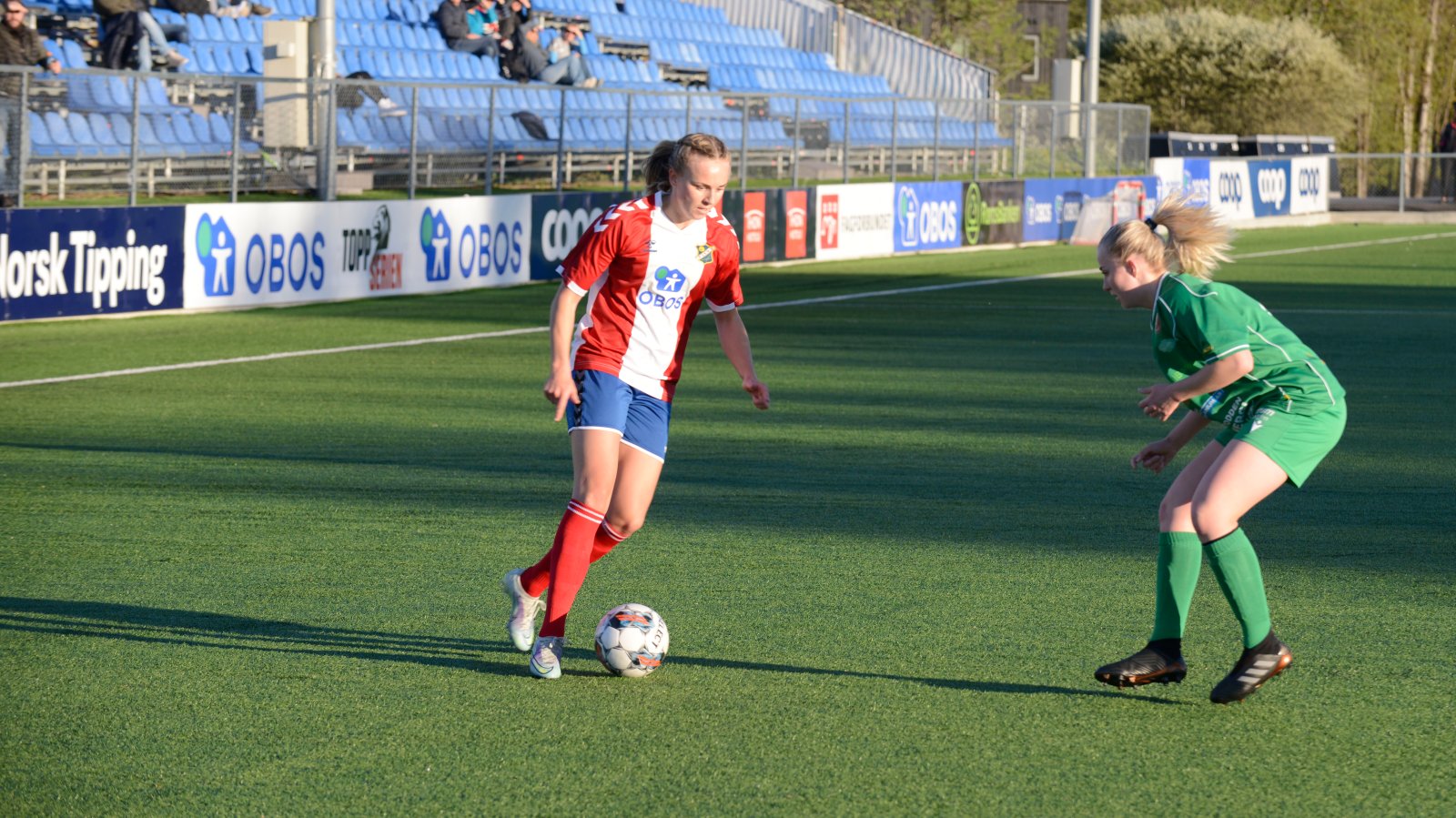 Det ble en jevn åpning på den NRK-sendte kampen med to lag som spilte med forholdsvis lav risiko de første minuttene. Våre jenter brukte likevel ikke lang tid på å vise hvorfor vi henger med i kampen om topp fire. Vi fikk flere situasjoner der Lyn satte LSKs forsvarsrekke under hardt press, noe som resulterte i noen gunstige brudd høyt i banen. Begge lag skapte flere mindre sjanser i første halvdel av kampen, uten at det resulterte i noen scoringer. Særlig Lyns høyreside med Cathinka Tandberg og Kamilla Melgård viste frem både gode kombinasjoner og godt forsvarsspill. Vertene kom på sin side til en del innleggsituasjoner, men Lyns forsvarsrekke og keeper Kirvil Odden Sundsfjord hadde god kontroll.
